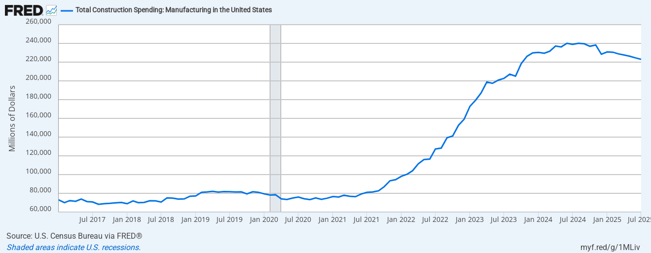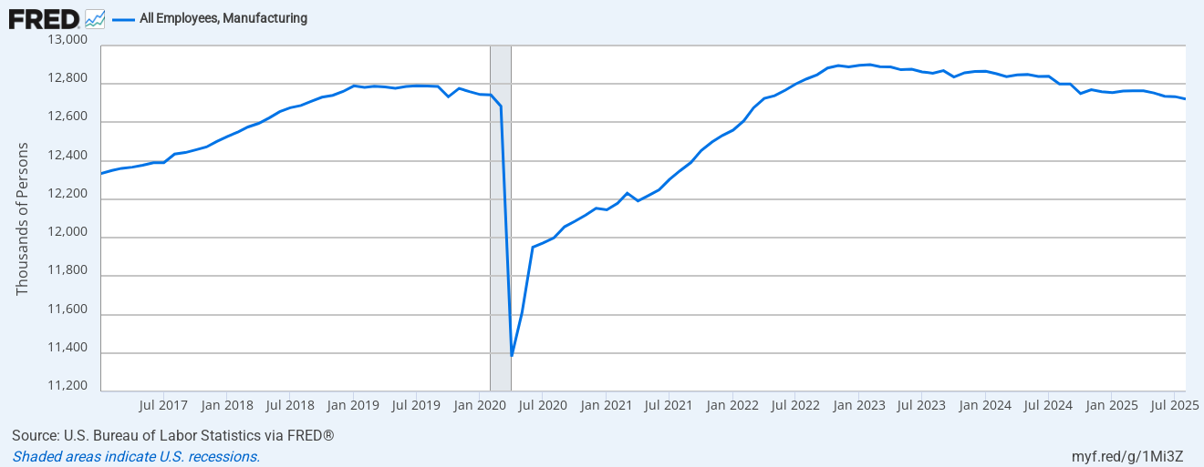 I’m rooting for more factory jobs, but we just aren’t seeing them yet. Wait a few months for interest rate reductions to kick in, tariffs to become more permanent, and several aspects of the tax code (expensing and depreciation) to show up in the data. Then we’ll have something to talk about.