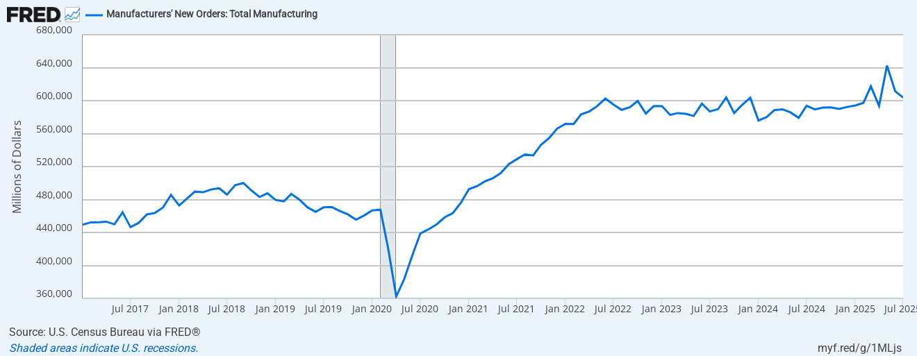 This data represents the volume of new purchase orders placed with manufacturers, and it has stayed within a narrow range of $570 to $605 billion over the past three-plus years with a little more volatility over the past few months. During times of recession, this data point drops like a rock. We just haven’t seen that happen yet.